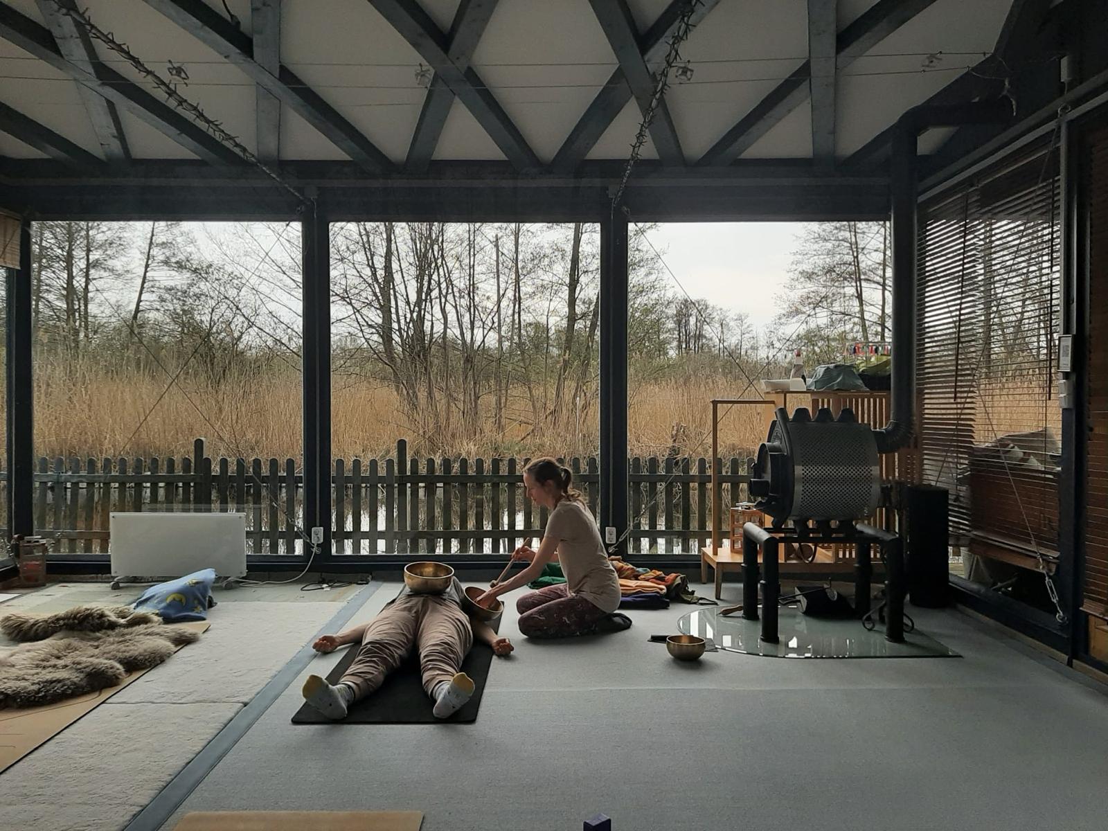 Begleitet von Klangschalenmeditationen, Mantra Singen, Schüttelmeditationen und Sauna.